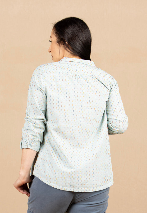 Who can resist this indigo velvet jacket? It’s one of those rare pieces that feels both elevated and easy to wear. The soft velvet drapes beautifully, adding a touch of luxury to even your most casual days. Thoughtful details like front patch pockets and a banded collar keep her practical.